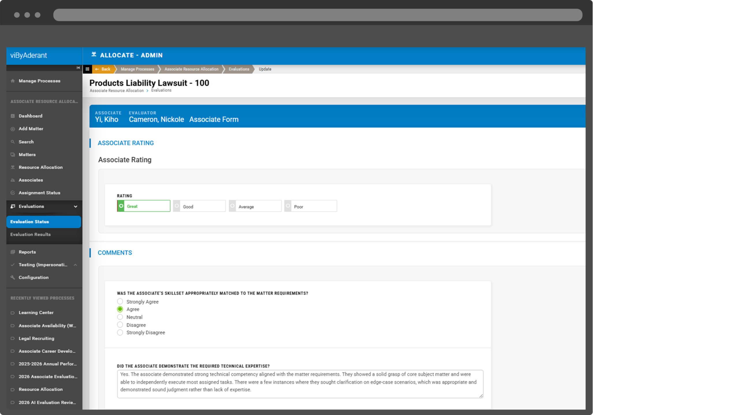 Capture performance insight where work happens. Gather feedback directly tied to specific matters or projects. Gain visibility into associate performance within real, recent work contexts. Leverage these insights to support staffing decisions moving forward.