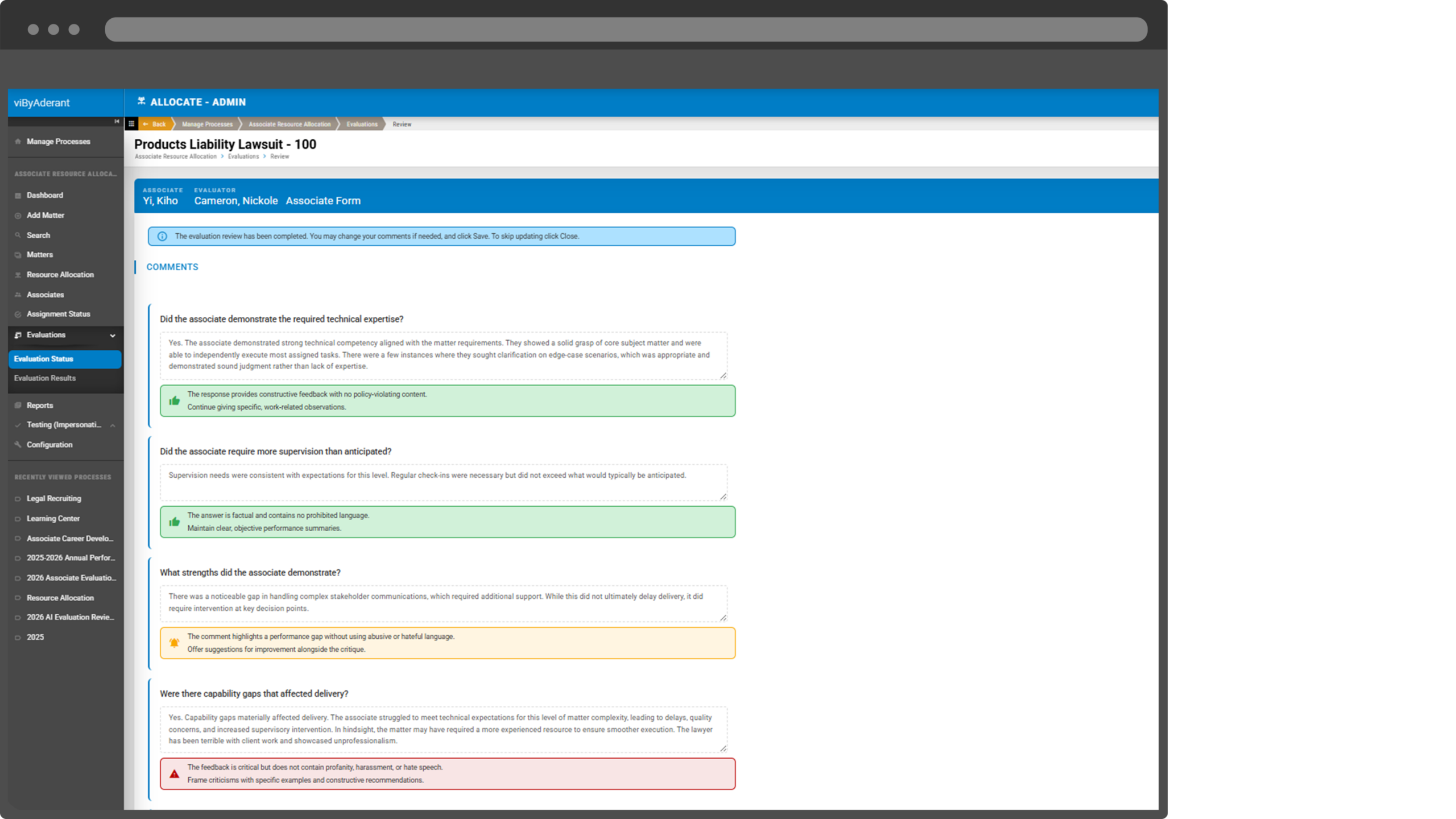 AI-powered sentiment analysis analyzes comments within project and matter-based evaluations before submission. Feedback is reviewed to highlight phrasing that may benefit from clarification or refinement. Consider these suggestions and revise evaluator comments accordingly to improve clarity.